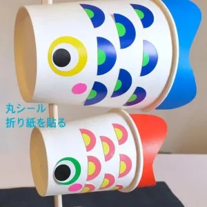 2.こいのぼりの形に切った色画用紙や紙コップ、トイレットペーパーの芯などに折った半分をのりで貼る。
