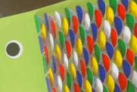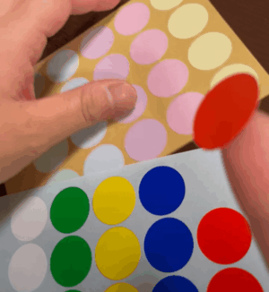 1.色のついた丸いカラーラベルシールを色違いで両面に貼りつけ、半分に折る。
